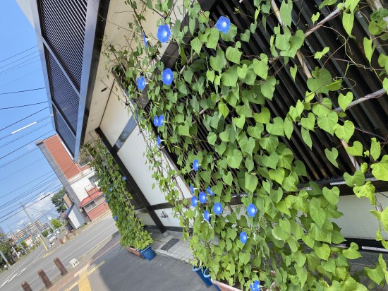 壁面の朝顔は、今年は数を減らして植えていますが、ここのところの暑さで毎日ぐんぐん成長し、花もだいぶん増えてきました。