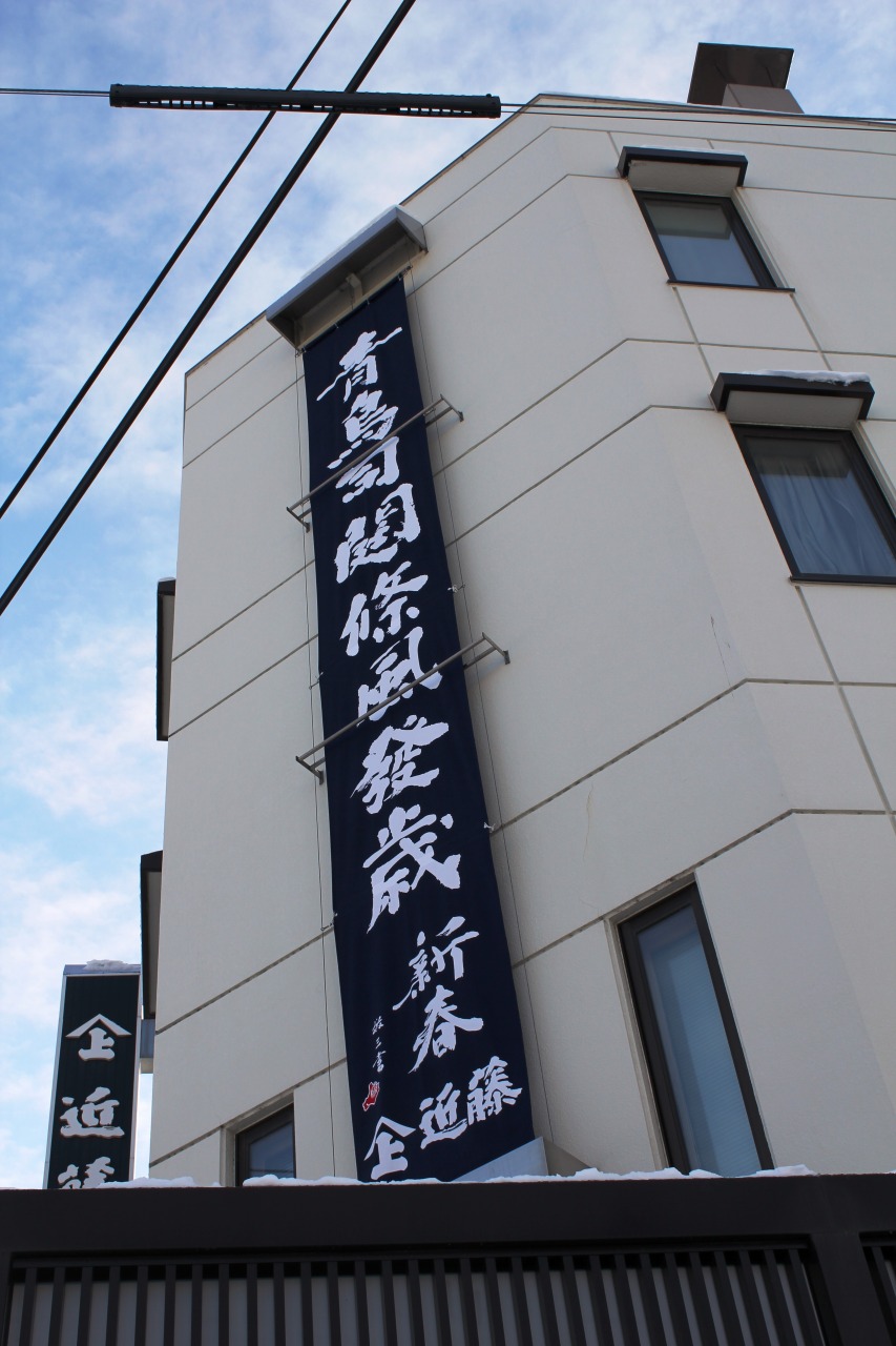 今年は酉歳、会社壁面には故・本間敬三先生に生前書いていただいた漢詩を、そしてショーウィンドーには今年新たに道立旭川美術館の菅沼肇館長に書いていただいた「酉」の文字を染め抜いた幕を掛けました。ぜひ、お近くにお越しの際はご覧ください。
